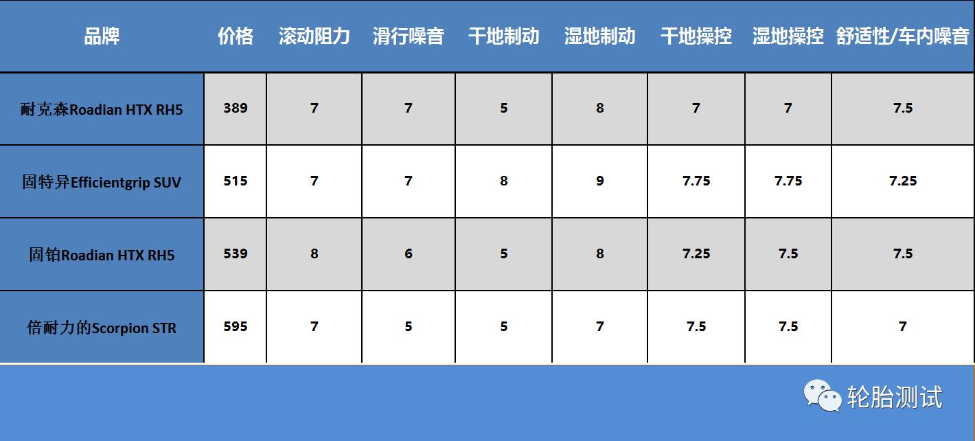 首先这4款全地形SUV轮胎分别是耐克森RoadianHTX RH5、固特异Efficientgrip SUV、固铂RoadianHTX RH5和倍耐力的Scorpion STR。