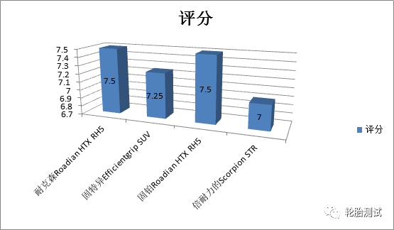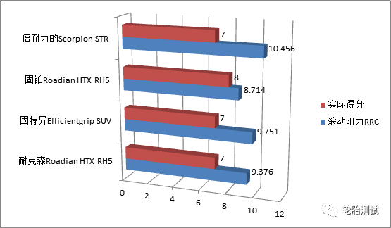 由于胎纹更加考虑非铺装路面行驶,所以在滚动阻力方面要明显大于城市型轮胎。尤其是倍耐力的蝎子胎已经比此次对比竞品大出一个维度。而作为固铂则在此项当中表现最为优异。