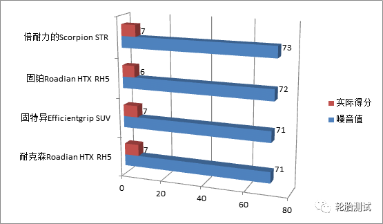 和滚动阻力结果一样,倍耐力再一次排名垫底,这在一定程度上还是跟其胎纹相对颗粒较大有关。固特异和耐克森则在此次测试中并列第一。