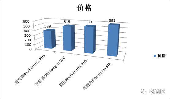 价格图表根据途虎养车网的价格作为数据依据,除了耐克森轮胎以外,剩余3款轮胎均超过500元/条的售价,所以无论耐克森表现如何,性价比方面的优势会使其大幅加分。