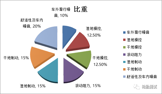 在将所有轮胎测试完毕后我们将按照各项成绩公布总成绩,首先先说明一下上述几项测试中各占的比重。