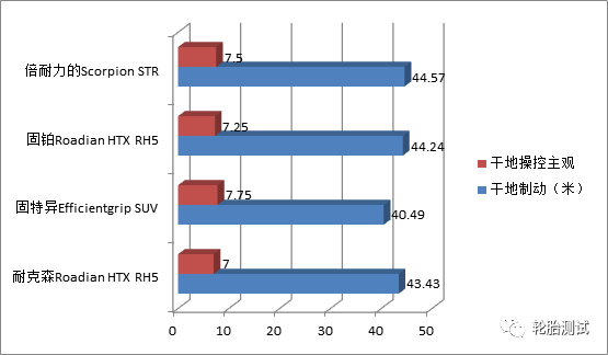 不对称花纹在全能型SUV轮胎上的使用,对于各项表现均属于尚佳的主观评价结果可谓功不可没。 在这样的整体设定之下,铺装道路的干地制动有