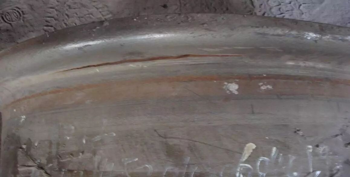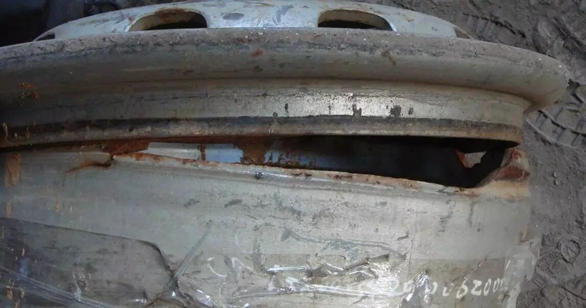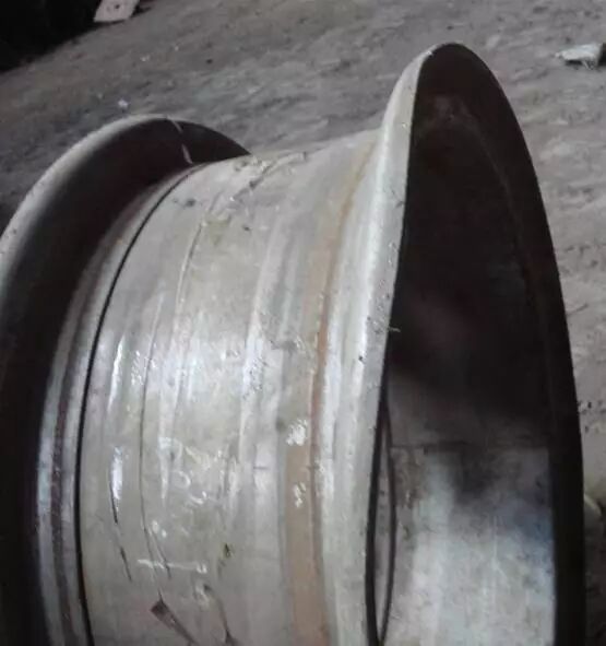 因型钢材料在轧制过程中出现微裂纹、疤痕等原因,造成钢圈小沿根部破裂(不包括因超载或碰撞等非正常使用引起的小沿撕裂)。这个是非常致命、非常危险的,图中可以看到:钢圈小沿根部已经破裂。在充气的时候非常容易造成轮胎从钢圈滑落,从而引起安全事故。
