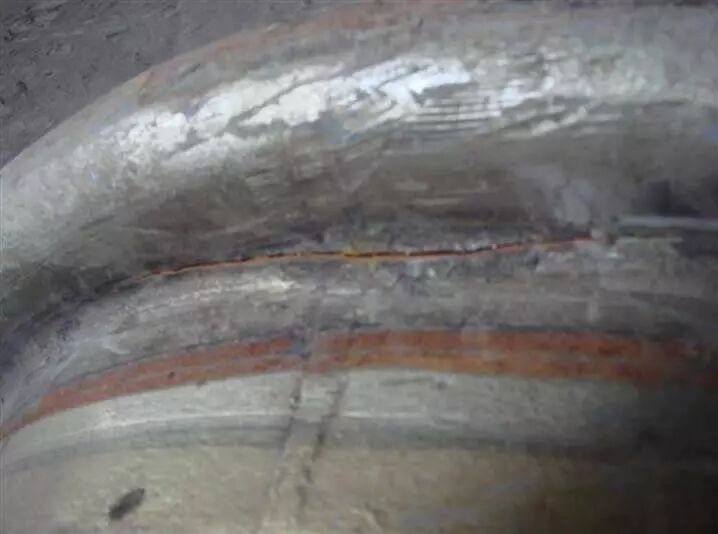 因钢圈轮辋焊接时受热软化,降低了材料的塑韧性,或由于刨渣低于材料本体、打磨印痕过深等原因,造成使用时降低了耐疲劳性能,造成早期破碎(不包括外力撞击造成的破裂)。