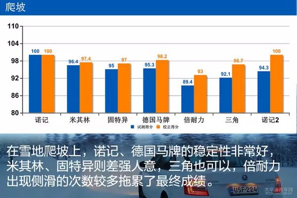 在雪地爬坡测试中,诺记和德国马牌的轮胎表现比其他四款稳定,米其林和固特异排第三和第四,三角和倍耐力比较靠后。虽然从时间来看,米其林的时间比德国马牌快,但考虑测试当天的温度变化比较快,而且根据测试时的表现,最有由校正值(诺记2)得出的结论,德国马牌稍微领先米其林。