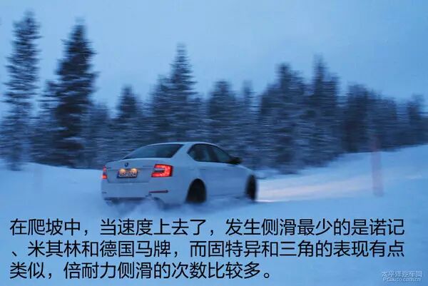 诺记的抓地力和加速表现很好,在雪道爬坡速度在70-80km/h时,能好好抓住地面,不会发生侧滑;在弯道时也能以较高的车速通过。米其林比诺记稍差,固特异的抓地力和米其林相似,但驾驶起来更稳定;德国马牌的抓地力和加速都比米其林和固特异强,而且稳定性不错。
