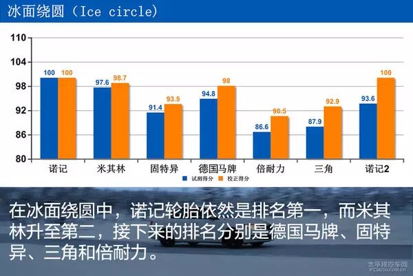 在冰面绕圆这个项目中,诺记依然排名第一,感觉它就是适应冰雪的环境;而米其林则是第二名。