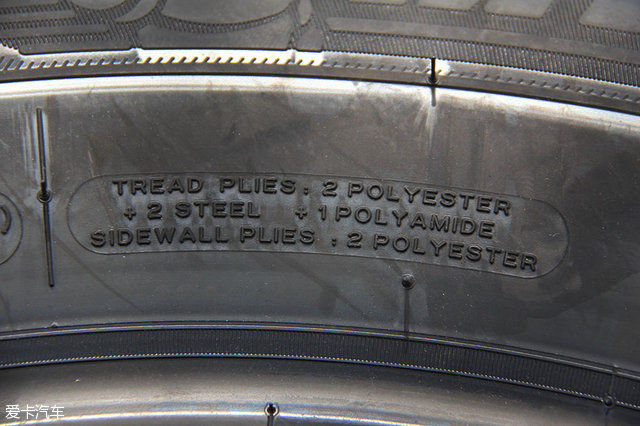 胎面由纤维帘布层*2、钢丝带束层*2、尼龙覆盖层*1构成,胎侧则有两层纤维帘布层。