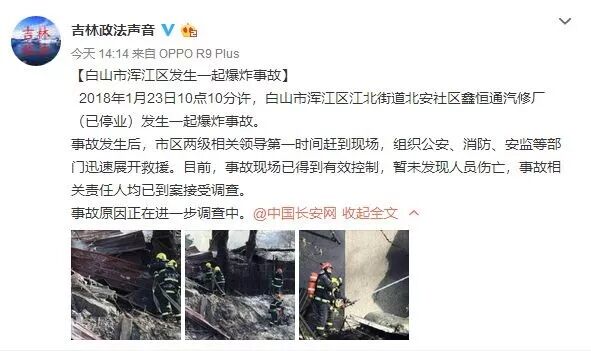 2018年1月23日上午十点零10分左右,白山市浑江区江北街道北安社区一汽车修理部发生一起疑似爆炸事故,事故发生后市区两级相关领导及公安、消防、安监等部门第一时间赶到现场,组织救援,事故现场得到有效控制,目前没有发现人员伤亡,事故原因正在调查当中。事后,多家官方媒体分别报道了此次事故,如下: