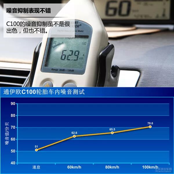 在怠速时,车内的噪音为51分贝,车内60km/h的平均噪音值为62.6分贝;80km/h时的平均噪音值为65.5分贝;100km/h时的平均噪音值为70.6分贝。