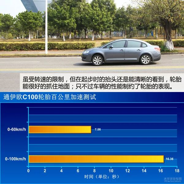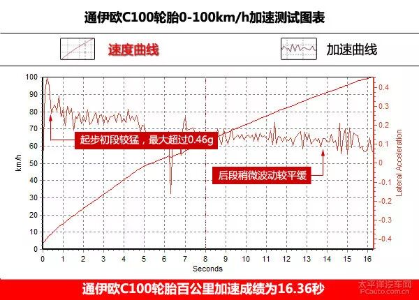 看数据,16.36秒的百公里加速时间,对于一款在花纹和胎体结构都有点像接近操控性型的轮胎,我看到也觉得不太相信;但从上面的图,和自己亲身测试的体验,我只能说这个数据不能代表C100的正真性能。因为轮胎受到车辆性能的制约太明显了,4挡自动变速箱的世嘉换挡响应时间实太慢了。