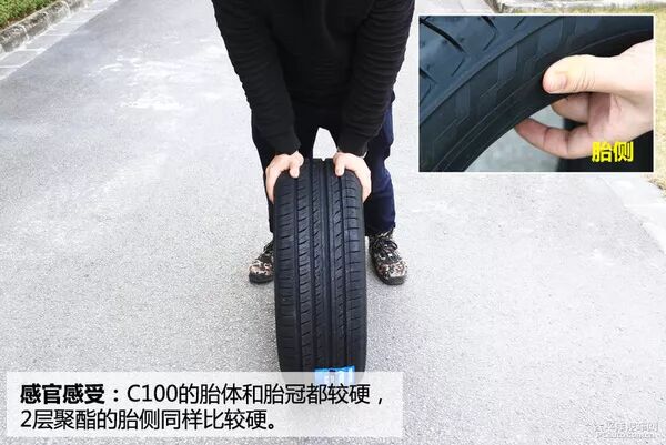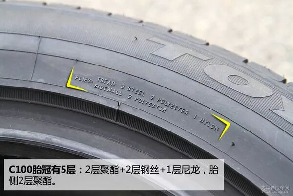 我们测试的这套C100的规格是205/55 R16 91V,它的胎冠有5层,2层钢丝+2层聚酯+1层尼龙,胎侧则是2层聚酯。而我在X宝上查找这款轮胎时,发现胎冠只有4层,这可能与生成的年份不同,在胎体结构都有所不同。5层的胎冠+2层胎结构无论是增强轮胎的刚性还是耐磨性能都有促进作用。