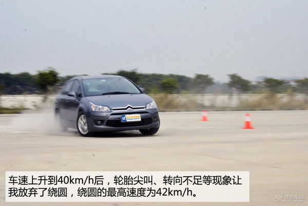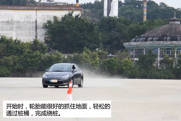 开始绕桩就不客气的猛踩油门,因为我很想知道C100轮胎的极限到底有多少,虽然车辆性能很一般,或者说不太理想,但当我踩下油门、松开刹车那刹,我还是能够感受到轮胎有力的抓地性能;当速度再继续攀升时驾驶车辆出桩桶,车辆的侧倾较明显,轮胎的尖叫也来了,推头比较严重;但轮胎还是能抓住地面,继续提高车速。