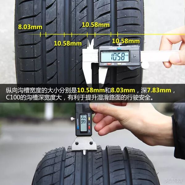 C100有四条大的纵向沟槽,它们的宽度由外侧到内侧分别是:8.03mm、10.58mm、10.58mm和10.58mm。而且,外侧还有三条较小的纵向沟槽与众多横向沟槽练成一体,这样的设计无疑是提高轮胎在湿滑路面的排水性能,增加车辆在湿滑路面的可控性;四条大的纵向沟槽的深度都是7.83mm。