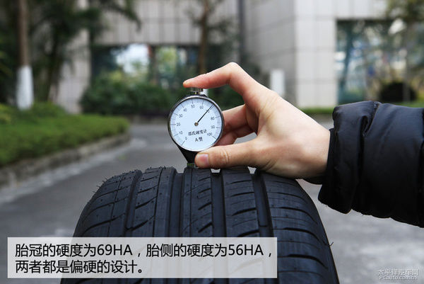C100的胎冠层硬度平均达到69AH,胎侧达到56AH,这个硬度对于一款偏舒适性的轮胎,确实有点大。当我们体形较胖的同事用身体去压胎体、用手去压胎冠和胎侧时,感到硬邦邦的。这么硬的轮胎对于舒适性影响有多大,而相反偏硬的设计对轮胎的操控又有着怎么样的影响?我们在动态测试的时候就能见分晓了。