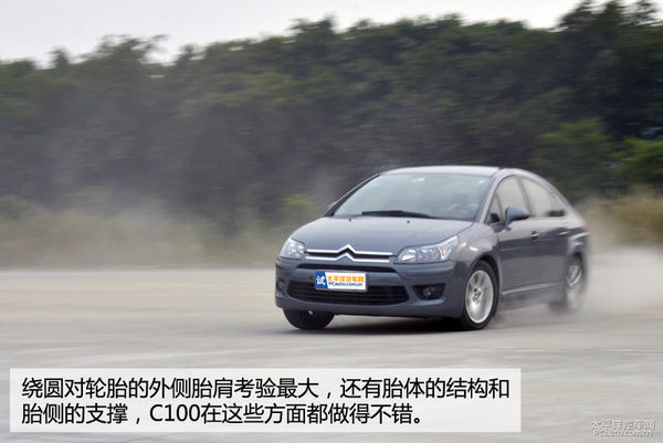 绕圆对轮胎的外侧胎肩考验最大,因为绕圆的时候基本上都是外侧胎肩与地面摩擦;另外一个就是胎体的结构和胎侧的支撑。在《轮胎大测试1》中,德国马牌MC5的绕圆成绩为44km/h,而C100是42km/h;相比,C100的表现还是可以的。