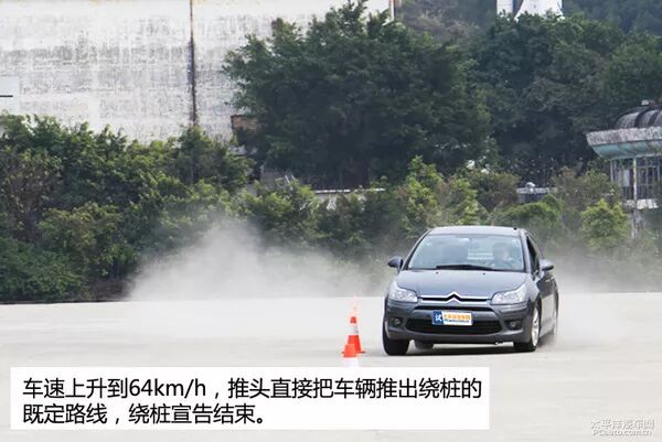 当车速上升到64km/h时,轮胎的尖叫声已经很大、推头也很严重,直接把车辆推出绕桩的既定路线,绕桩宣告结束,轮胎的极限就是64km/h了。这个极限绕桩的速度,对C100来说来得很正常,我再静态体验时就已看出它具有较高的极限。C100较硬的胎体、胎冠和胎侧,已经外侧较大块的胎肩设计,都给它在极限绕桩中提供了很好的支撑。