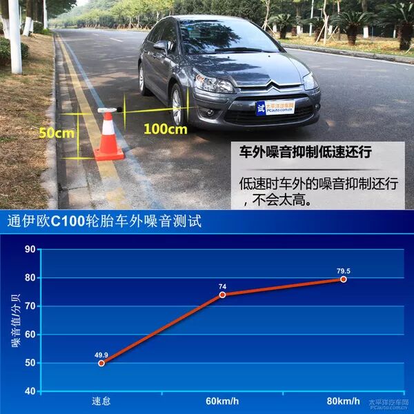 车外的环境噪音为49.9分贝,而车外60km/h车速时的噪音平均值为74分贝,100km/h车速时的噪音平均值约为79.5分贝。车外的噪音控制。