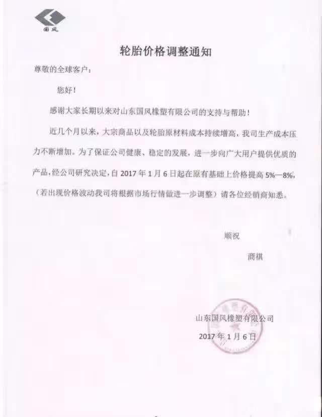 近几个月以来,大宗产品以及轮胎原材料成本持续增高,公司决定自2017年1月6日起在原有基础上价格提高5%-8%。