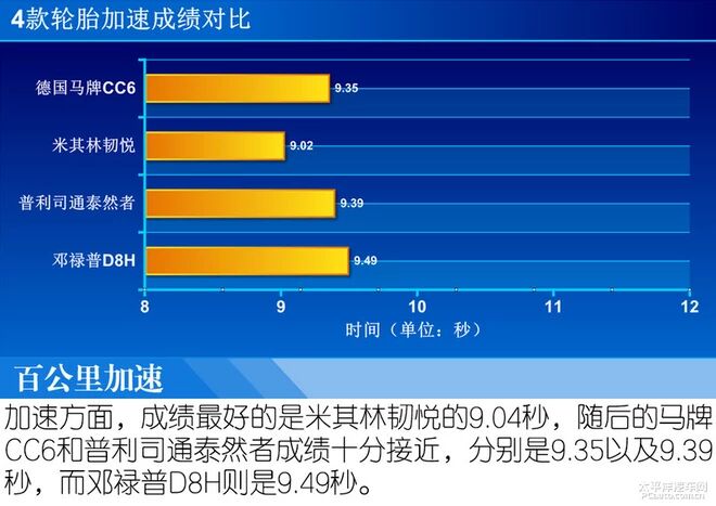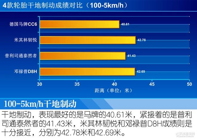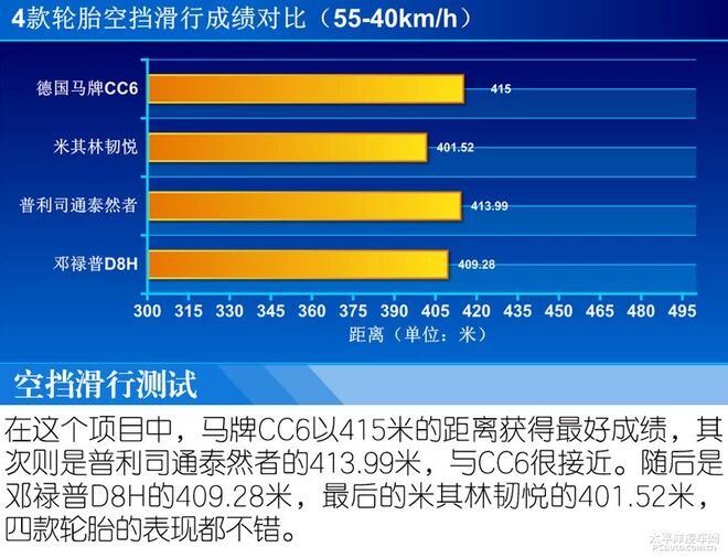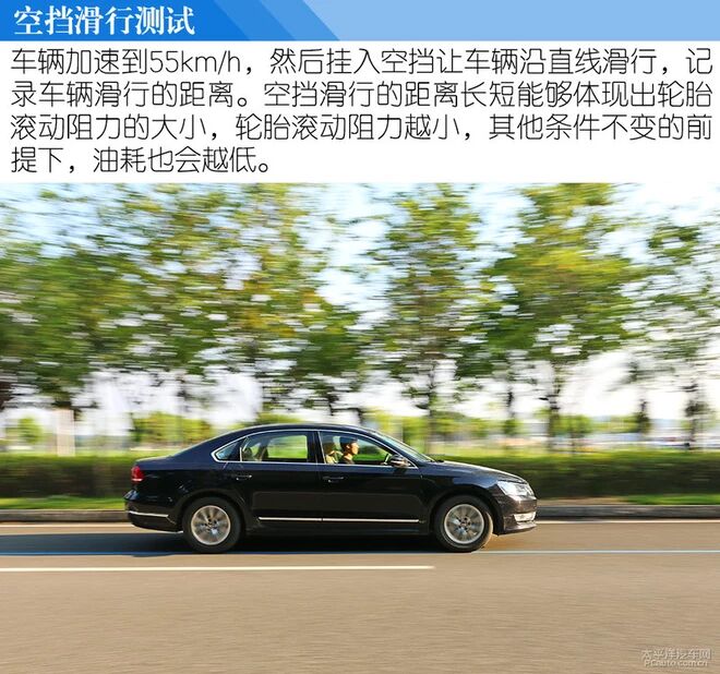 按照以前的规矩,空挡滑行时加速到55km/h后挂入空挡,然后车辆沿直线行驶,直到车辆停下后记录车辆滑行的距离,但是由于这四款轮胎在帕萨特上滑行至停下来的距离比我们的测试路面要长不少,所以我们只能采取记录55km/h-40km/h这个速度内的车辆滑行距离,距离越长同样表示轮胎滚阻越小经济性越好。