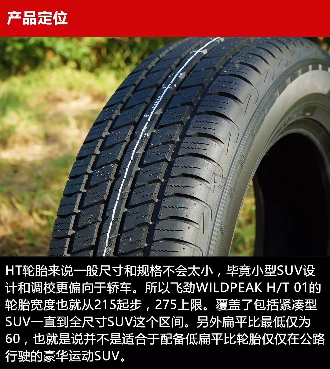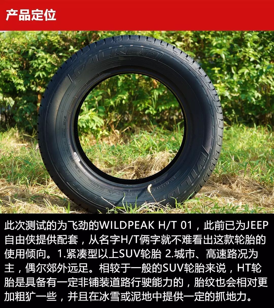 与此同时,对于飞劲轮胎来说,完善现有产品线也是非常重要的发展策略,在SUV市场大热的环境下,陆续推出适合中国路况的产品。去年车与轮就曾经测试过一款飞劲品牌的高性能豪华SUV轮胎,详情点击《感受驾驶乐趣飞劲FK453CC高性能SUV轮胎赛道测试》。这一次我们又拿到了一款飞劲WILDPEAK系列的城市SUV轮胎,飞劲正在逐渐丰富其产品线,逐渐向更为广阔的民用级市场发力,这从飞劲与欧洲红军利物浦签订了下赛季的合作也能看出飞劲准备在未来大干一场。飞劲轮胎这款WILDPEAK H/T 01作为换代产品,各项性能均比前代产品提升和优化,那我们车与轮轮胎测试就非常有必要真刀真枪的来试探一番这款产品的本领。