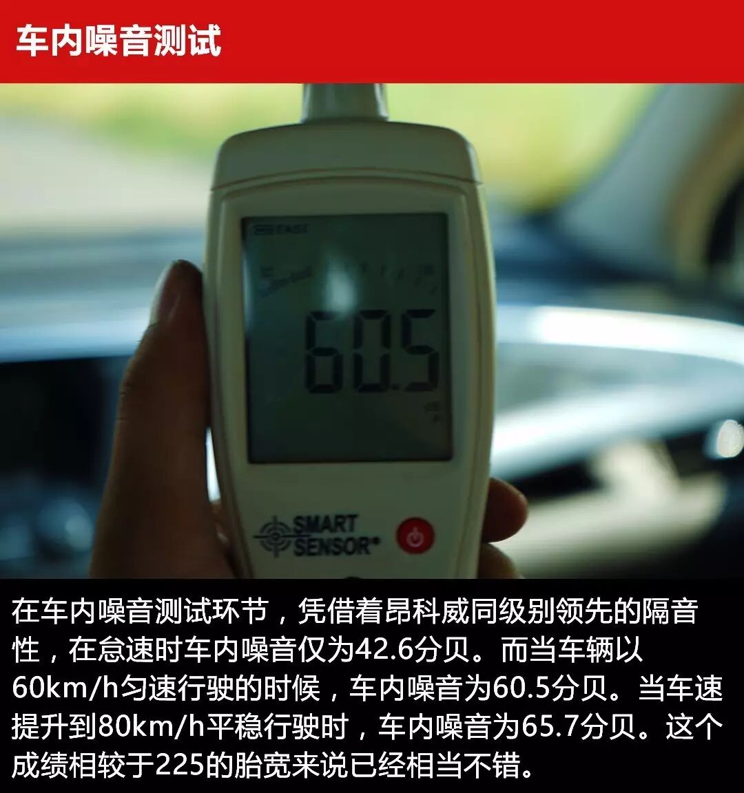 车内噪音测试,我们使用噪音仪测试60km/h、80km/h车速下的车内噪音的大小,每个速度测试五次取样,并以五组数据的平均值作为最终成绩。