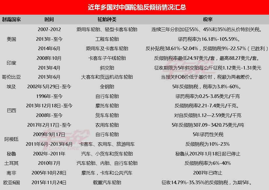 多个国家对中国轮胎反倾销情况汇总