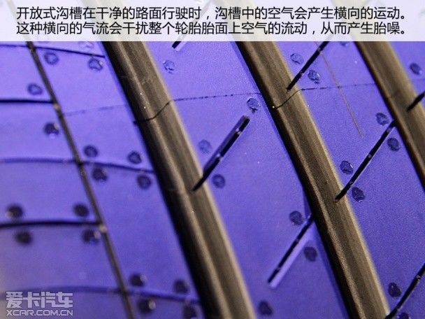 当然,沟槽中泥土都能够通过,空气也同样能够通过,不过这就会产生一些问题。由于开放式沟槽在干净的路面时,沟槽中的空气会产生横向的运动。这种横向的气流会干扰整个轮胎上空气的流动,从而产生胎噪。而固特异御乘Ⅱ代轮胎的这种封闭式沟槽设计,能够很大程度上的避免胎面上的空气横向移动,从而减少这一部分胎噪的产生。