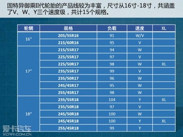此外,固特异御乘II代轮胎的产品线较为丰富,从16寸-18寸,涵盖了V、W、Y三个速度级,共计15个规格。