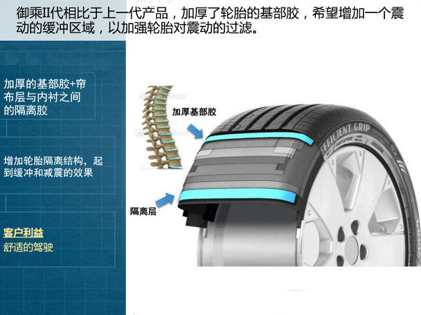 此外,为了满足豪华型轿车对舒适性的要求,御乘II代相比于上一代产品,加厚了轮胎的基部胶,希望增加一个振动的缓冲区域,以加强轮胎对震动的过滤。