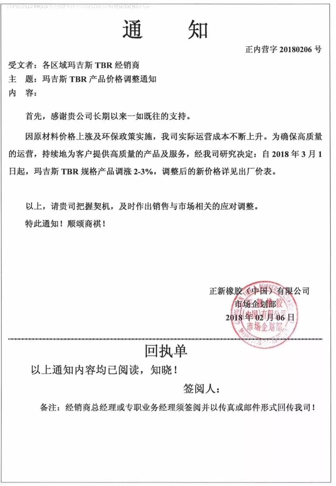 从17年11月开始,到18年1月的两个多月时间中,轮胎企业涨价不断,涨价通知单一张接着一张的发,直到最近的一段时间,才是消停了下来。最近也是听到有人在说:涨价潮已经尘埃落定,很多同行也是信了,毕竟好久没见到轮胎企业的涨价通知单了。但就在这时,玛吉斯却是把涨价通知单发了出来。