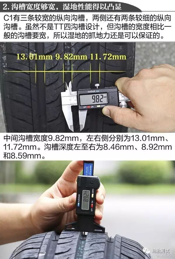 三条较宽的主沟槽加上两条的细沟槽,保证了湿地的排水性以及抓地力。同时,C1中部花纹使用了防夹石设计,能有效较少石子被夹留在轮胎上的几率。