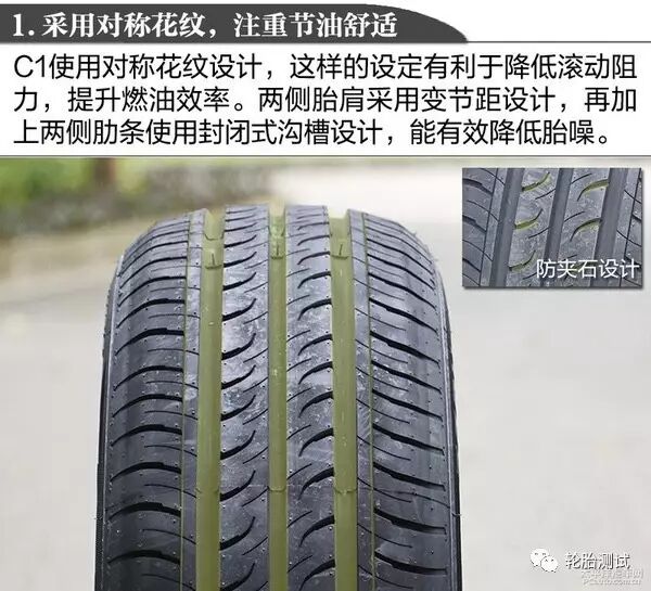 C1的定位是节油舒适轮胎,主打省油耐用静音。从C1的轮胎花纹看,C1采用了常见的对称花纹设计,有利于减少轮胎滚动阻力,节省燃油,并且在静音舒适性上会有一定帮助。C1并没有使用常见的四条纵向沟槽设计,而是采用三粗两细的沟槽设计,再加上轮胎的纳米高分散硅胶成分,能获得较好的湿地抓地能力以及良好的排水性。