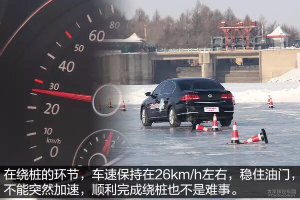 我首先驾驶的是冰锐客XG01轮胎,由于在冰面上驾驶,起步时不敢给太多油,很担心因为给多油了车子失控。但轻轻踩下油门踏板时,能感受到轮胎在打滑,速度表上到10km/h,车辆能稳定的缓缓前行。然后稍微深踩油门,经行绕桩,车速保持在26km/h左右能完成绕桩,主要油门控制一定要稳住,不能突然加速。