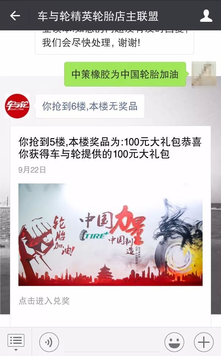 在车与轮公共号下方回复各企业的口号,“为中国轮胎加油助威”,参加抢楼活动,就能赢得100元大礼包.是不是很简单,每人每天能够抢10次,大侠们分配好时间来抢吧!