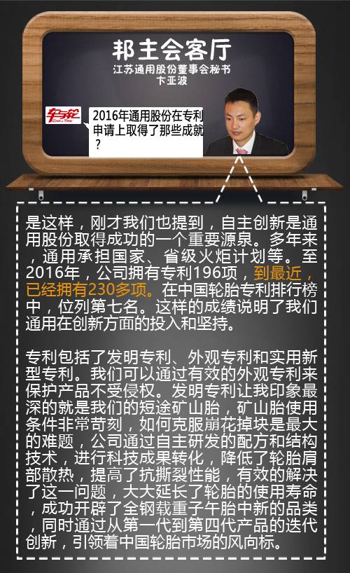 通用股份在很短时间内拥有230多项专利并是不是偶然,是全公司人在“产品即人品”、“匠心精神”等公司理念影响下的必然结果。相信未来,通用股份在家用轿车轮胎上也将达到其在卡客车轮胎上的高度,成功做到“打造中国具有国际影响力的民族轮胎高端品牌”这一愿景,我们一起在这里为通用股份加油!为中国轮胎加油!