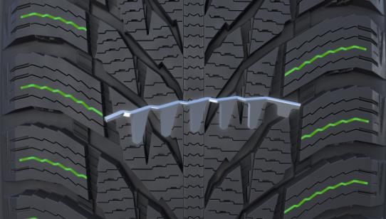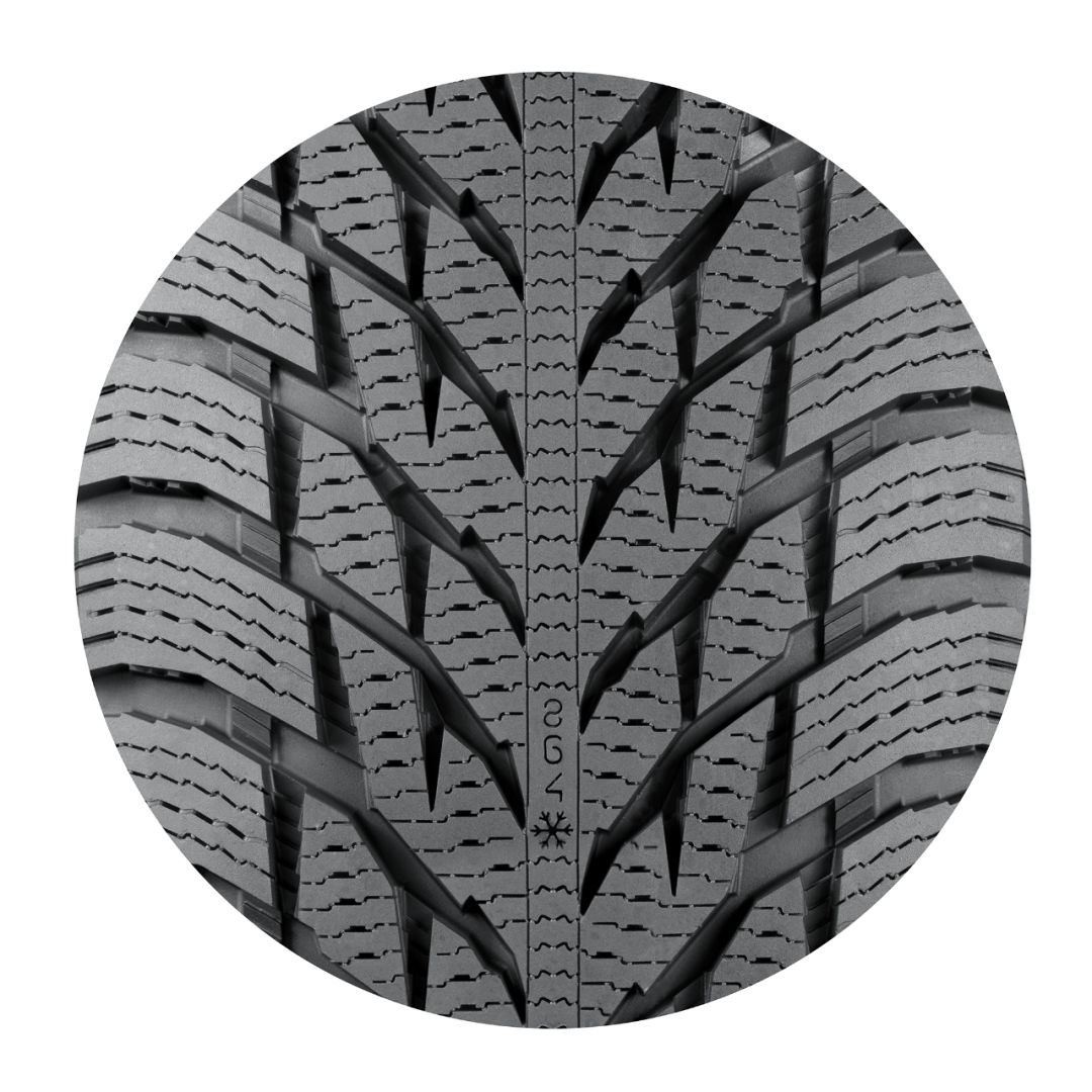 Hakkapeliitta R3轮胎中心花纹块,采用树状中央花纹块细纹加强了轮胎中心区域,从而使胎面花纹块紧密结合在一起,即使在干燥路面高速行驶时,也能保证良好的驾驶稳定性与安全性。
