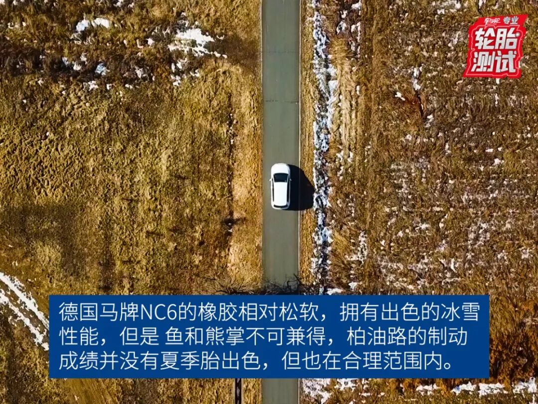 在80-0km/h的制动测试环节中,德国马牌NC6和夏季胎的成绩分别为30.8米和26.7米,二者的制动距离也都在一个安全范围内。其中德国马牌NC6稍逊一些,主要原因来自于橡胶材质的不同,德国马牌NC6的橡胶比较松软,在冰雪道路上的性能会更加优异,而30.8米也并不是一个差成绩,在日常行驶时,能够保证车辆拥有安全的制动距离。