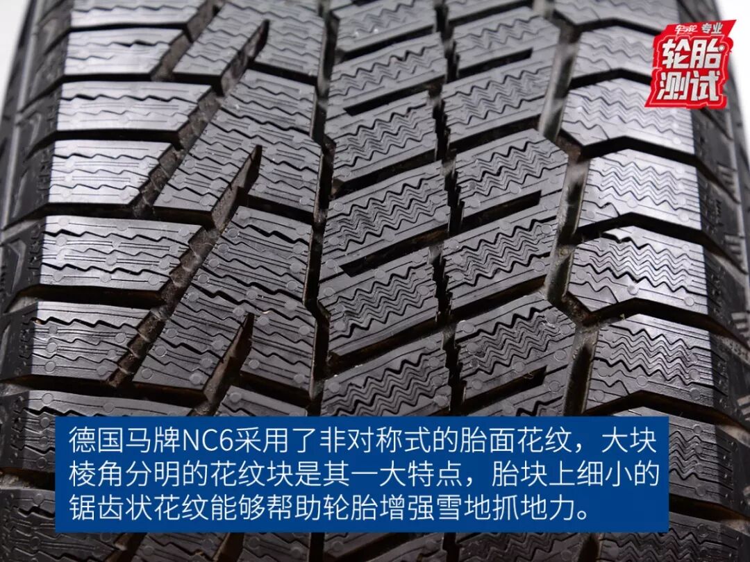 德国马牌NC6作为一款冬季胎,在橡胶材质和花纹设计上与普通的夏季胎有着很大的区别。通常这一类的轮胎胎侧都有着“M+S”和雪花山峰的标识,其中“M+S”代表着轮胎适用于泥地和雪地,雪花山峰的标识则代表轮胎通过了芬兰严苛的雪地测试,冰雪性能有着一定的保障。