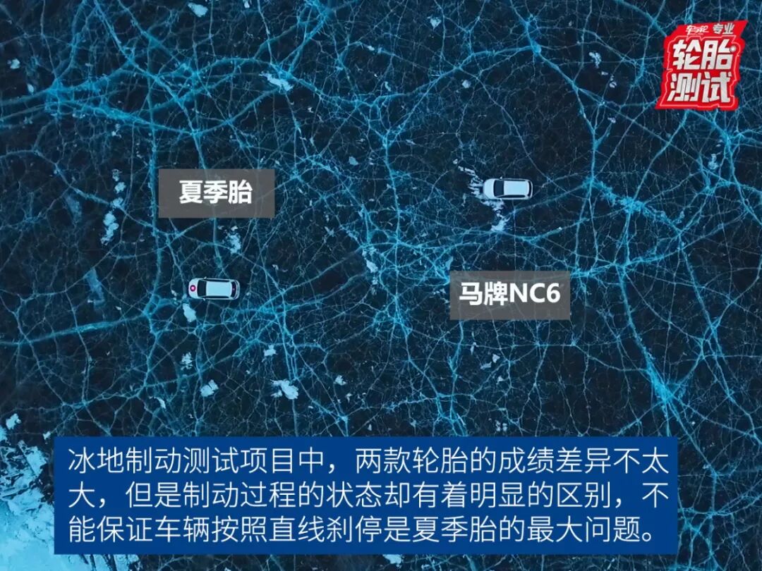 在马牌NC6的冰地制动过程中,车辆虽然不能紧急刹停,但是能够按照指定的路线(正前方)行驶,直至车辆静止。但是在夏季胎制动时,车辆的不可控性大大增加,总会出现车辆偏离路线失控的现象,因为轮胎的表面附着力过低,也很难从驾驶层面救回车辆,大大的增加了车辆的不安全性。