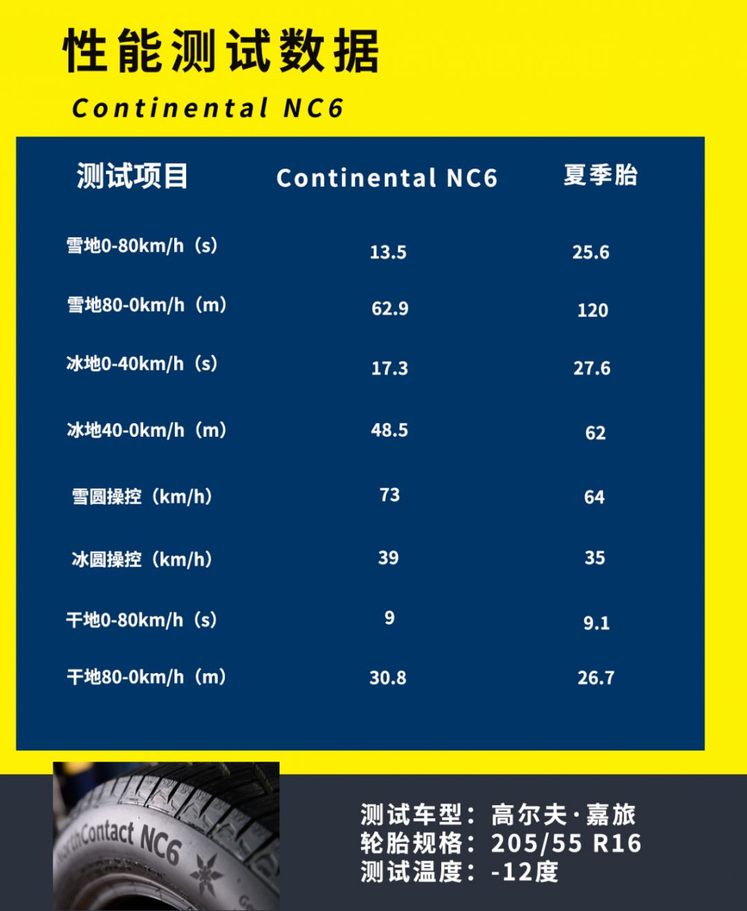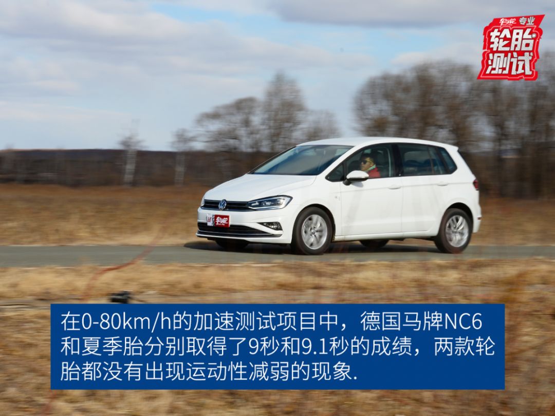 除了冰雪测试以外,本次测试也对两款轮胎进行了柏油路面的80km/h加减速测试。在0-80km/h的加速测试项目中,德国马牌NC6和夏季胎分别取得了9秒和9.1秒的成绩,从测试数据来看,两款轮胎都没有出现运动性减弱的现象,此外测试车辆官方的百公里加速时间为13.6秒,可以说两款轮胎在柏油路面加速性能都很优秀。