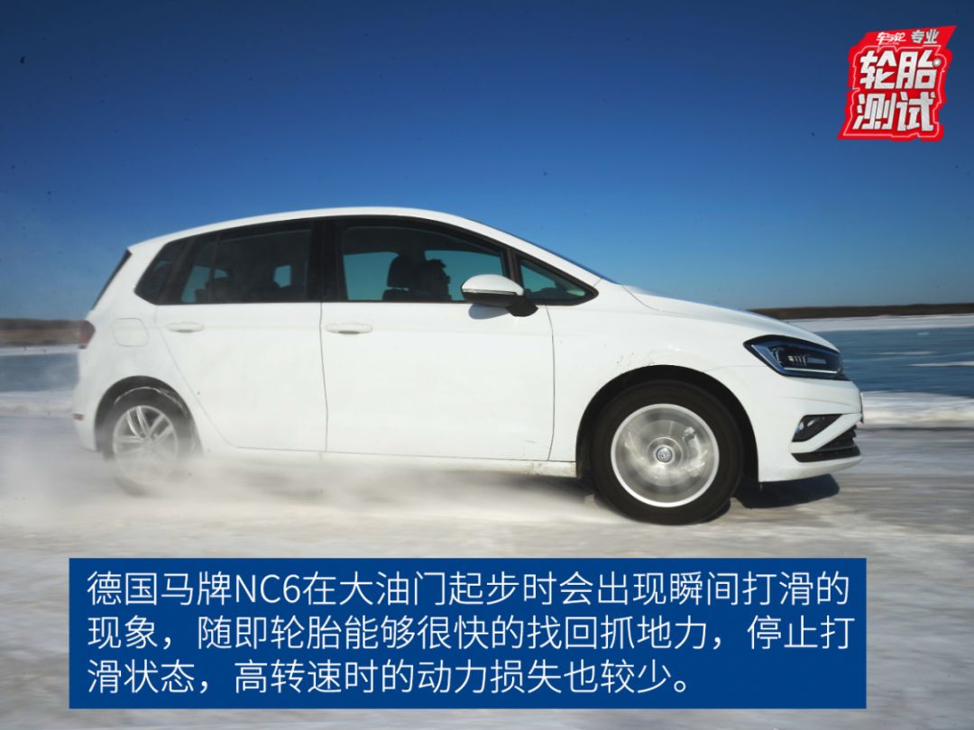在雪地的0-80km/h加速测项目中,德国马牌NC6在大油门起步时会出现瞬间打滑的现象,随即轮胎能够很快的找回抓地力,停止打滑状态,让车辆向前行进。在加速过程中,高转速区间也能够保证动力的有效传输,取得成绩为13.5秒。