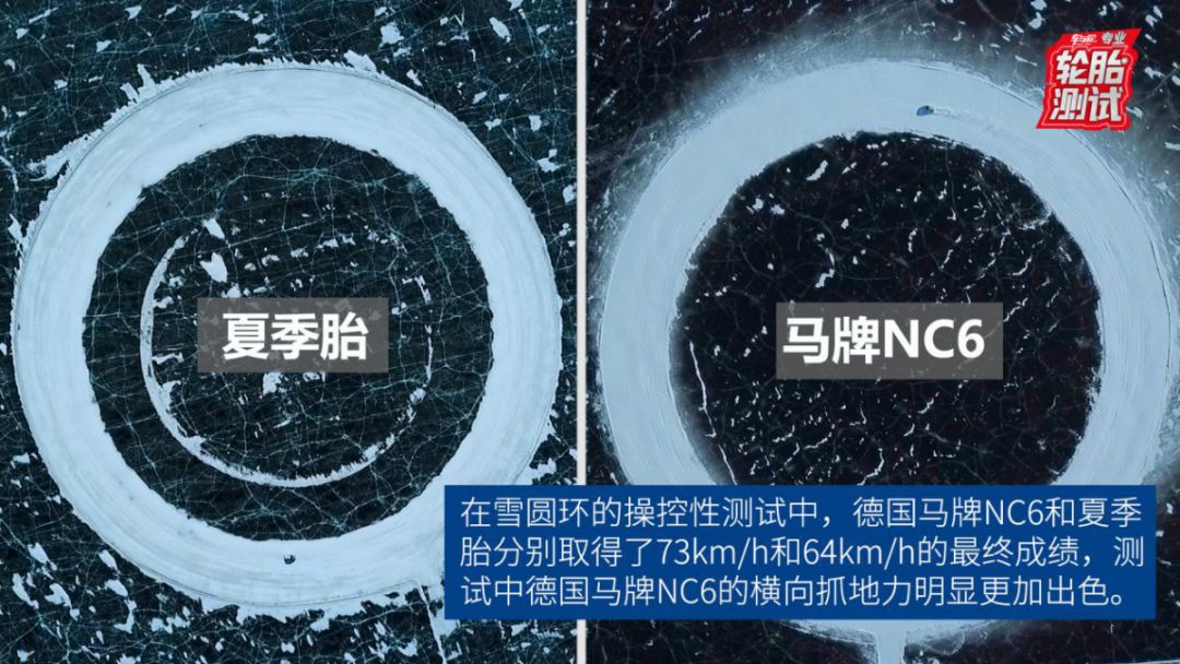 在雪圆环测试中,德国马牌NC6和夏季胎分别取得了73km/h和64km/h的最终成绩,在测试过程中,因为德国马牌NC6的耐低温软橡胶配方和花纹拥有着更强的雪地抓地力,所以行驶的过程更易操控,车身姿态也更加舒展。夏季胎虽然也达到64km/h的成绩,但是在测试时,为了使车辆达到一个较高的速度,经常出现车辆失控和救车的现象,车身姿态并不优美。