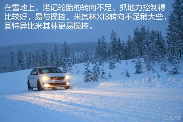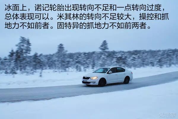 诺记Hakkapeliitta R2在雪地的转向不足、抓地力表现都不错,而且易与操控。米其林XI3在转向不足方面,比诺记稍微严重一些,抓地力比诺记差,而且ESP介入的次数比诺记要多。固特异Ultragrip ice 2相比米其林更容易操控,横向抓地力稍微比米其林好。