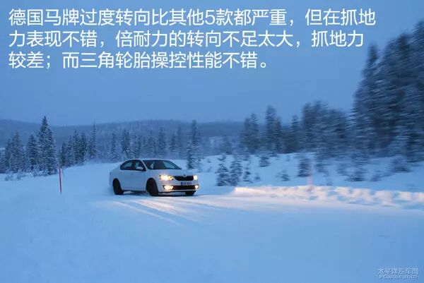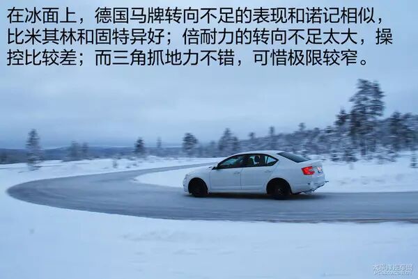 德国马牌的转向不足和诺记的类似,在抓地力的极限、易操控和抓地力表现都比米其林和固特异的好。而倍耐力的转向不足较大,在冰面上较难操控。三角则是转向不足和转向过度都有,抓地力力表现不错,只是抓地力的极限比较窄。
