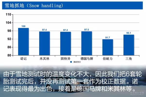 测试当天的气温变化不大 ,因此我们在最后并没有再测试一边诺记的轮胎,6套轮胎测试完后,得出的成绩由高到底依次是诺记、德国马牌、米其林、固特异、三角和倍耐力。前后两款成绩相差较大,而中间三款,德国马牌、米其林和固特异的成绩比较接近。