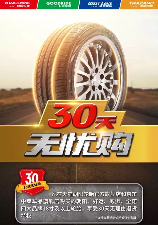 据了解,双11期间,朝阳轮胎销量再次实现了新的突破,成为最受欢迎的国产轮胎品牌。朝阳轮胎凭借放心可靠的轮胎产品,遍布全国的销售网络,已经成为轮胎替换市场的热门品牌。 为了更好地回馈广大用户的对于朝阳轮胎的信赖,朝阳轮胎还特意推出“30天无忧购”,凡在天猫朝阳官方旗舰店购买的朝阳、好运、威狮、全诺四大品牌18寸及以上轮胎,享受30天无理由退货特权。 网购之后,还在担心轮胎安装问题吗?据介绍,朝阳轮胎天猫旗舰店也已经打通了全国代理商仓储体系,线上下单,全国各省分仓发货,保证快速及时送达合作门店,免去车主购胎“最后一步”的安装烦恼。 同时,朝阳轮胎还特意推出了购胎上保险服务,即在朝阳轮胎正规门店购买15寸及以上乘用车轮胎(非营运车辆使用),就可免费领取中策轮胎保一份。