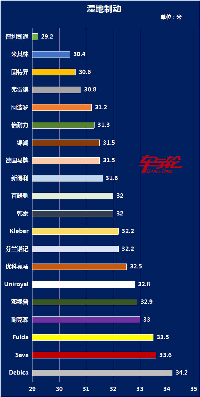 从上图足可以看出,普利司通的湿地制动性能是遥遥领先的,与第二的米其林和第三的固特异拉开较大差距。冰锐客LM 005作为20款轮胎中唯一一款制动距离小于30m的轮胎,其安全性是不言而喻的。