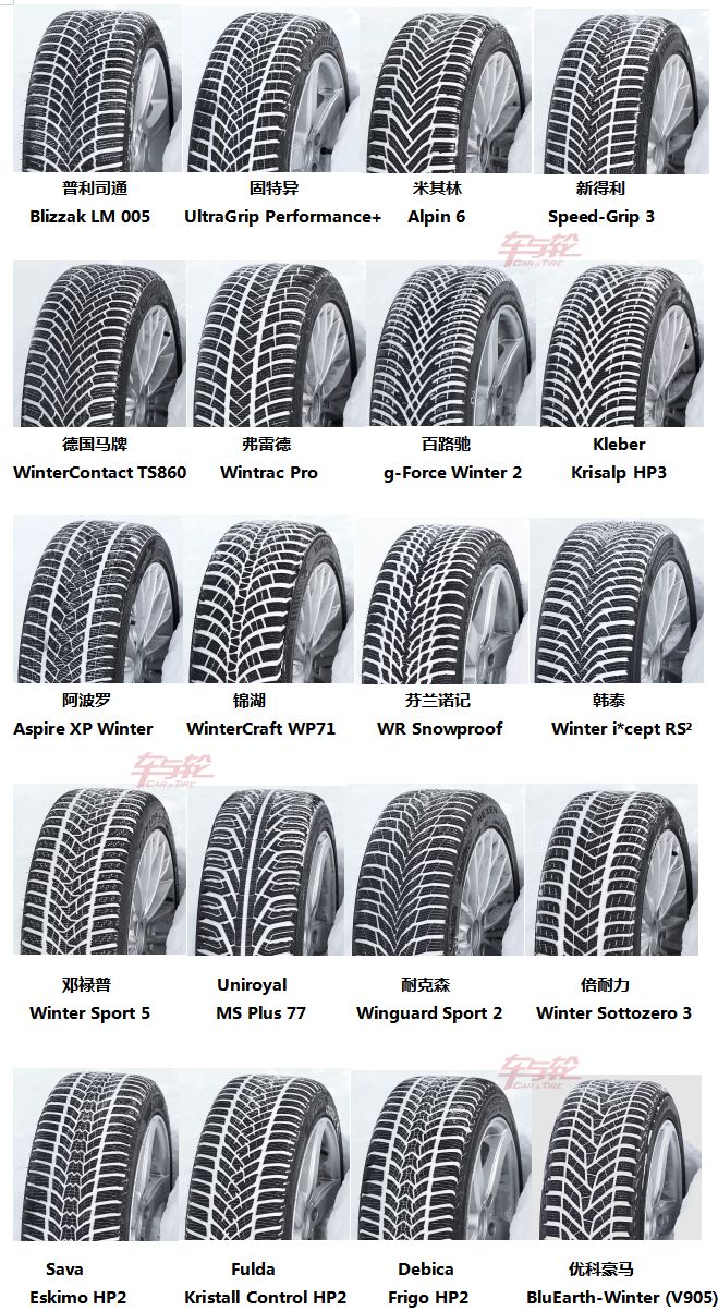 不难看出,前二十名中没有国产轮胎的身影,都是清一色的外资品牌。其中普利司通的冰锐客系列最强势,LM 005以53.8米的超短总制动距离(雪地+湿地)位列第一,固特异和米其林紧随其后。德国马牌WinterContact TS860以56米的成绩排在第五。以下是20款轮胎图片: