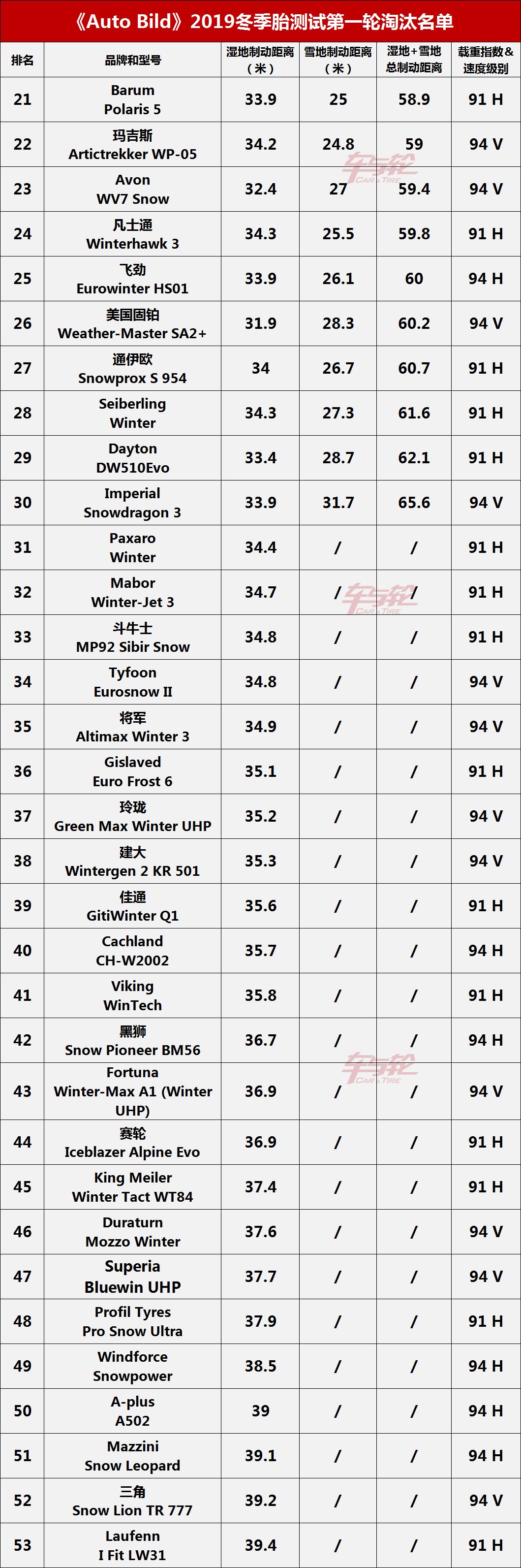 据了解,此次53款轮胎中共淘汰了33款,均无缘《Auto Bild》第二轮测试。值得注意的是:排名30名以后的轮胎直接因湿地制动成绩太差而跳过了雪地制动测试,直接淘汰。